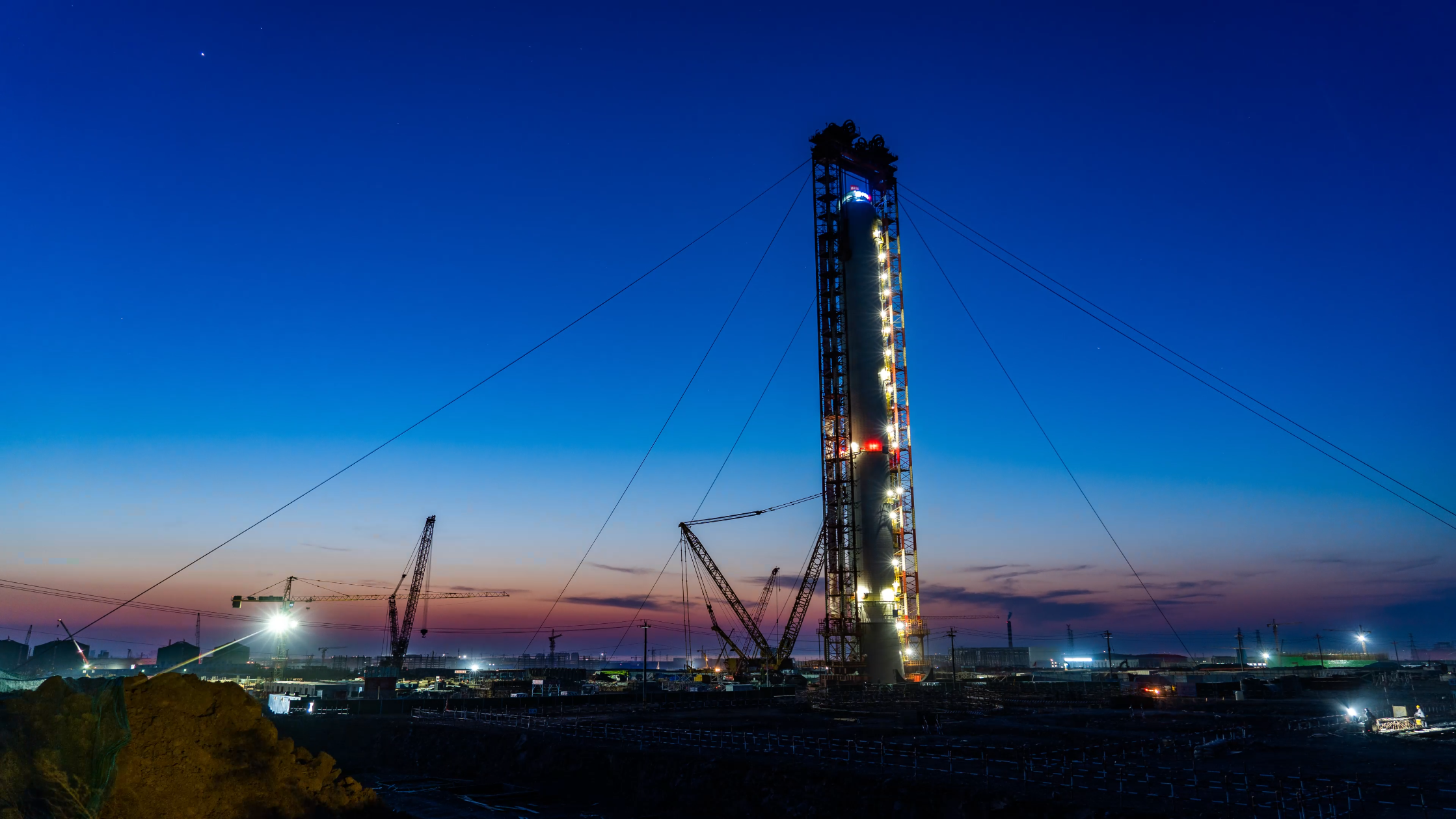 该塔是世界级90万吨/年丙烷脱氢装置的核心设备,全长138.6米、最大直径10.8米、重达2558吨、容积11039立方米,是全球最大的丙烷丙烯分离塔。从装船出港到停泊靠岸,从陆上运输到安全进场,从穿衣戴帽到塔立灯亮,全程历时26天7小时,完成了全球最大分离塔落位耸立,刷新了全球整体制造、整体运输、整体交付的产品分离塔的最快纪录。