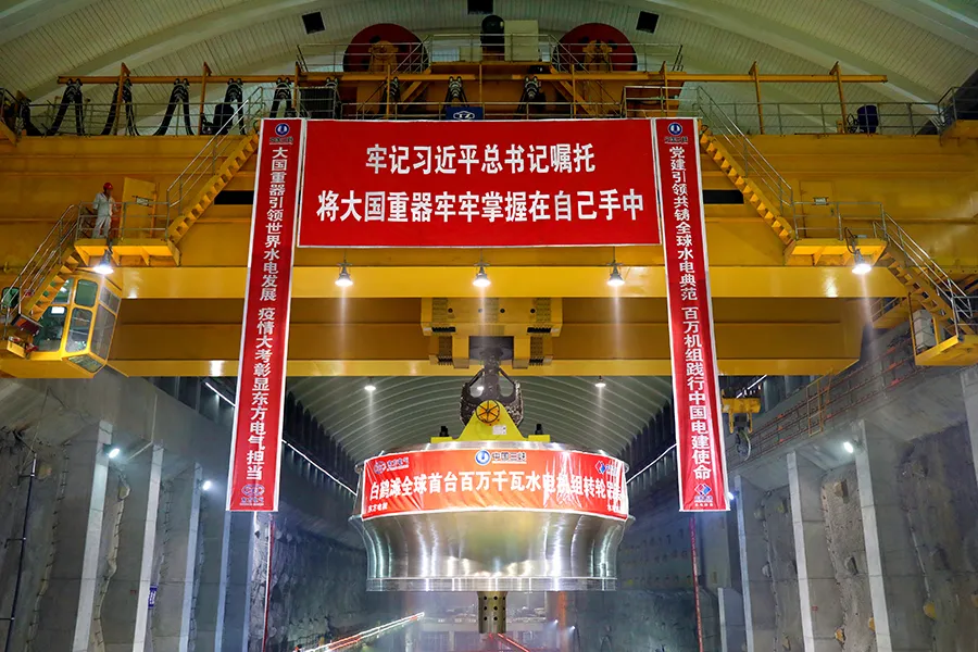 白鹤滩水电站左岸1号机转轮成功吊入机坑就位,标志着东方电气集团东方电机有限公司(以下简称“东方电机”)研制的全球首台百万千瓦水电机组精品转轮吊装成功。首台转轮吊装是白鹤滩水电站2020年机组安装的首个重大节点,是疫情大考下,以东方电机为代表的中央企业努力推动大国重器建设,奋力夺取疫情防控和经济社会发展双胜利的出彩答卷。